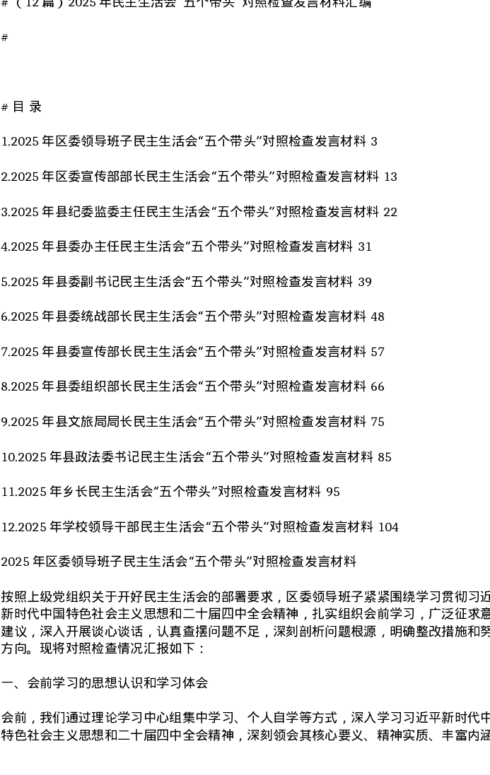 汇编:2025年xxxxx五个带头对照检查发言12篇