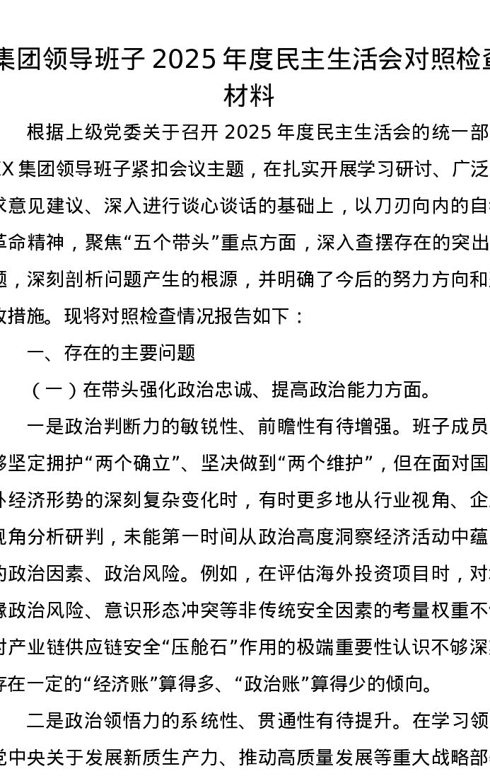 集团领导班子2025年度xxxxx对照检查材料(五个带头)