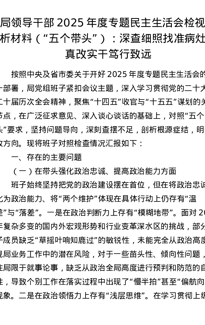 局领导干部2025年度专题xxxxx检视剖析材料(五个带头):深查细照找准病灶,真改实干笃行致远