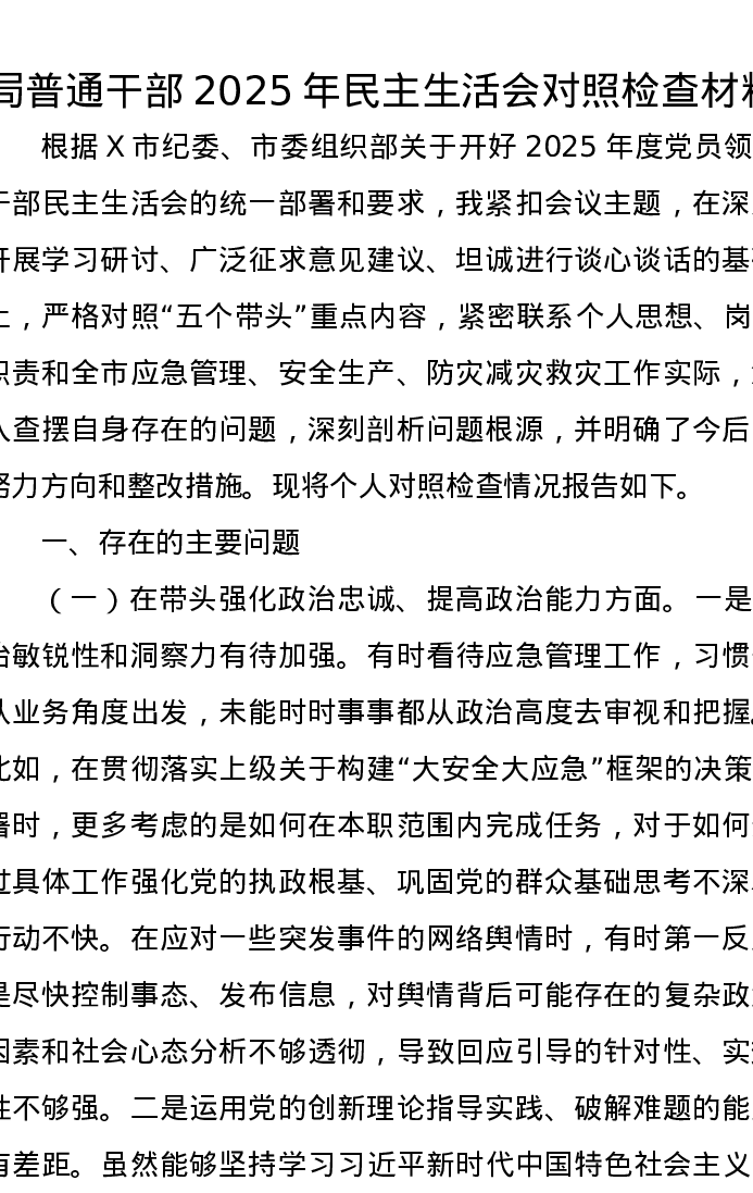 局普通干部2025年xxxxx对照检查材料(五个带头)