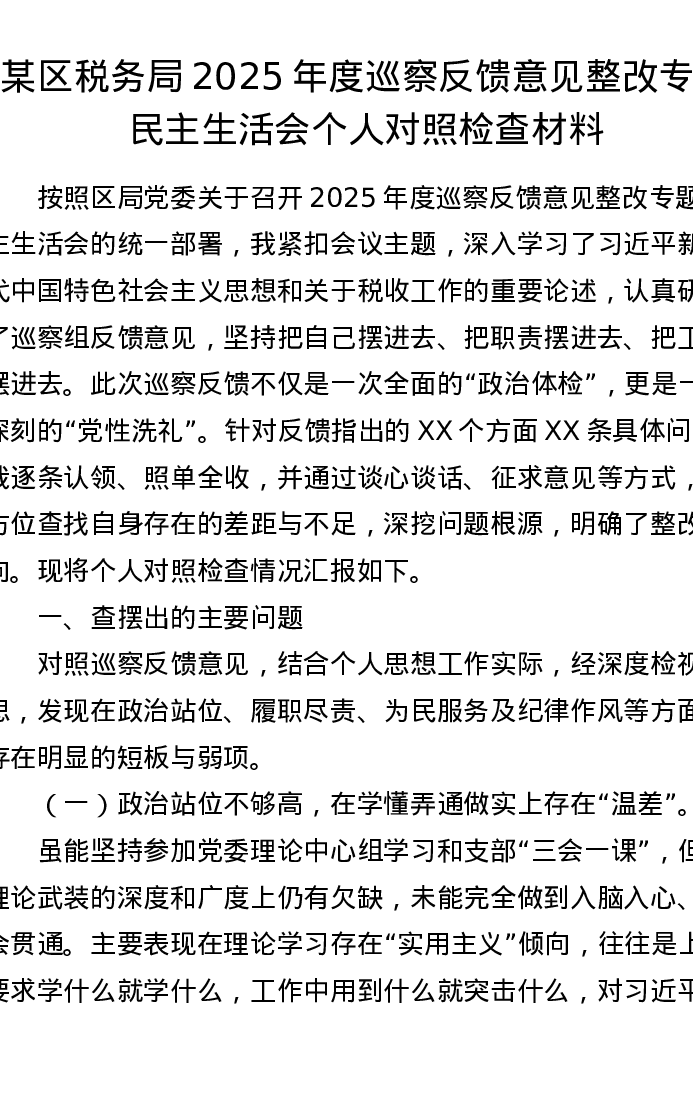 某区税务局2025年度巡察反馈意见整改专题xxxxx个人对照检查材料