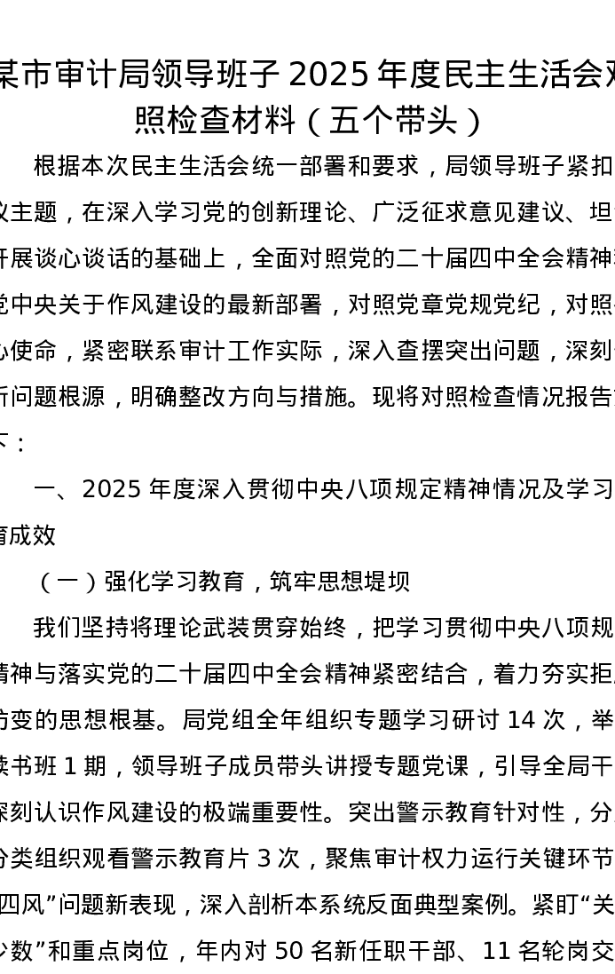 某市审计局领导班子2025年度xxxxx对照检查材料(五个带头)