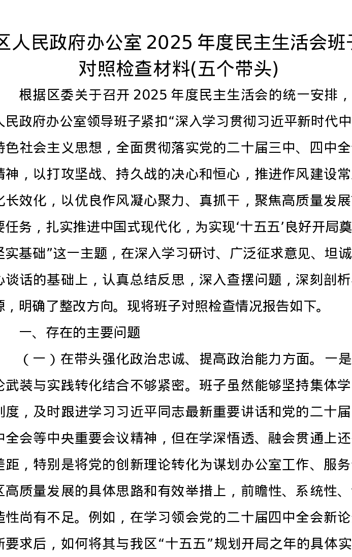 区人民政府办公室2025年度xxxxx班子对照检查材料(五个带头)