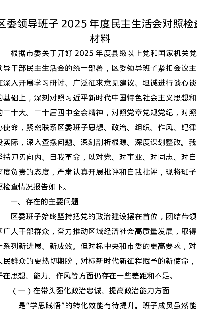 区委领导班子2025年度xxxxx对照检查材料(五个带头)