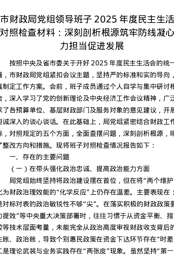 市财政局党组领导班子2025年度xxxxx对照检查材料(五个带头):深刻剖析根源筑牢防线 凝心聚力担当促进发展