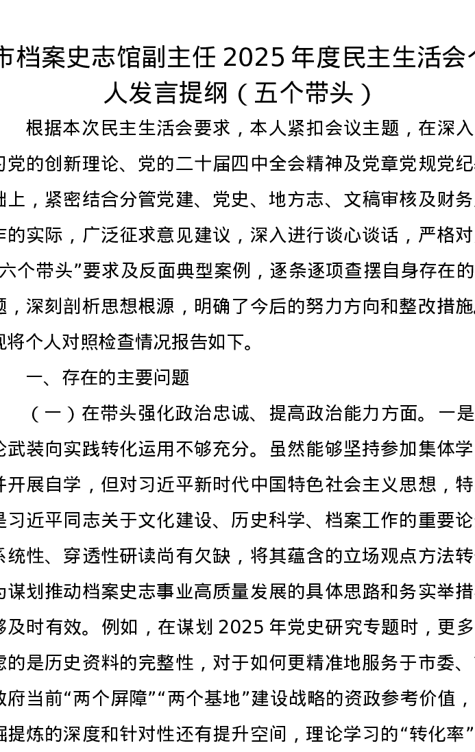 市档案史志馆副主任2025年度xxxxx个人发言提纲(五个带头)