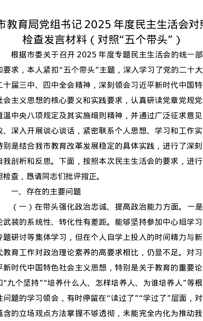 市教育局党组书记2025年度xxxxx对照检查发言材料(五个带头)
