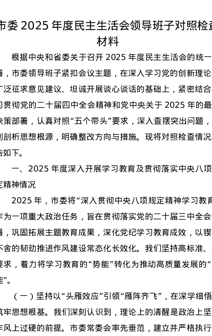 市委2025年度xxxxx领导班子对照检查材料(五个带头)