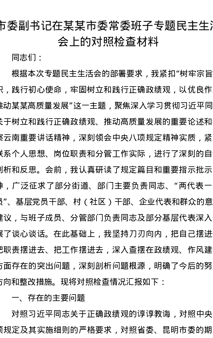 市委副书记在某某市委常委班子专题xxxxx上的对照检查材料