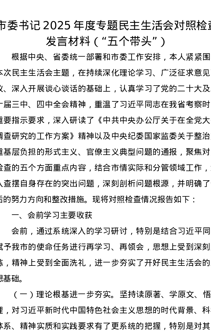 市委书记2025年度专题xxxxx对照检查发言材料(五个带头)