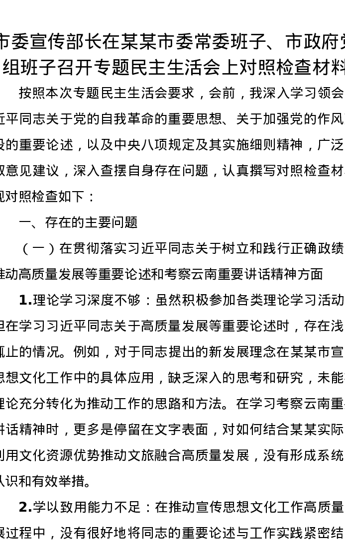 市委宣传部长在某某市委常委班子、市政府党组班子召开专题xxxxx上对照检查材料