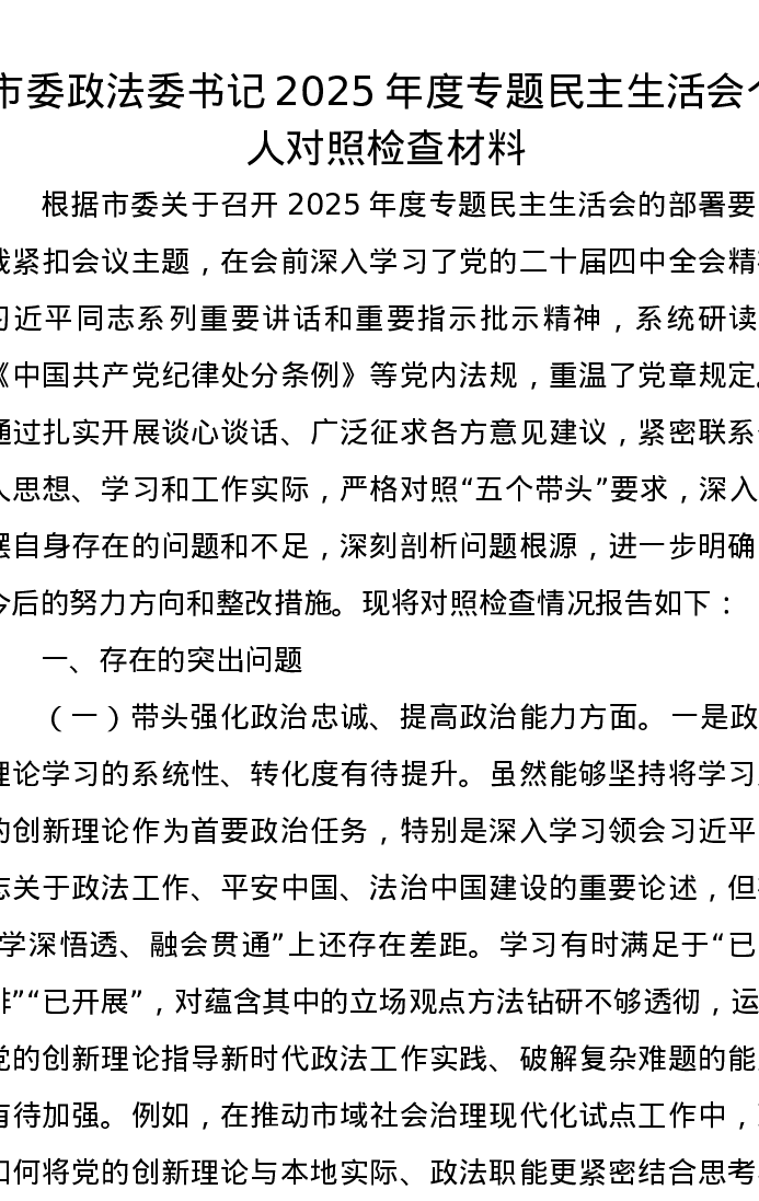 市委政法委书记2025年度专题xxxxx个人对照检查材料(五个带头)