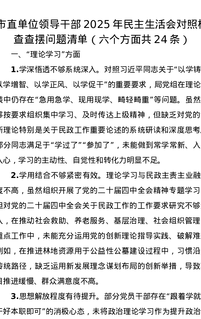 市直单位领导干部2025年xxxxx对照检查查摆问题清单(六个方面共24条)