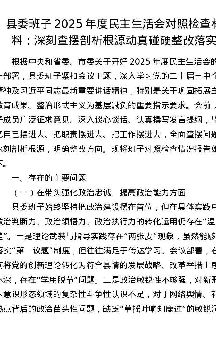 县委班子2025年度xxxxx对照检查材料(五个带头):深刻查摆剖析根源 动真碰硬整改落实