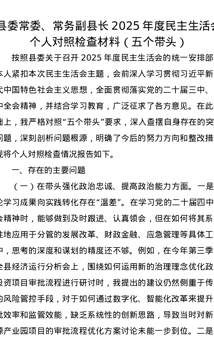 县委常委、常务副县长2025年度xxxxx个人对照检查材料(五个带头)