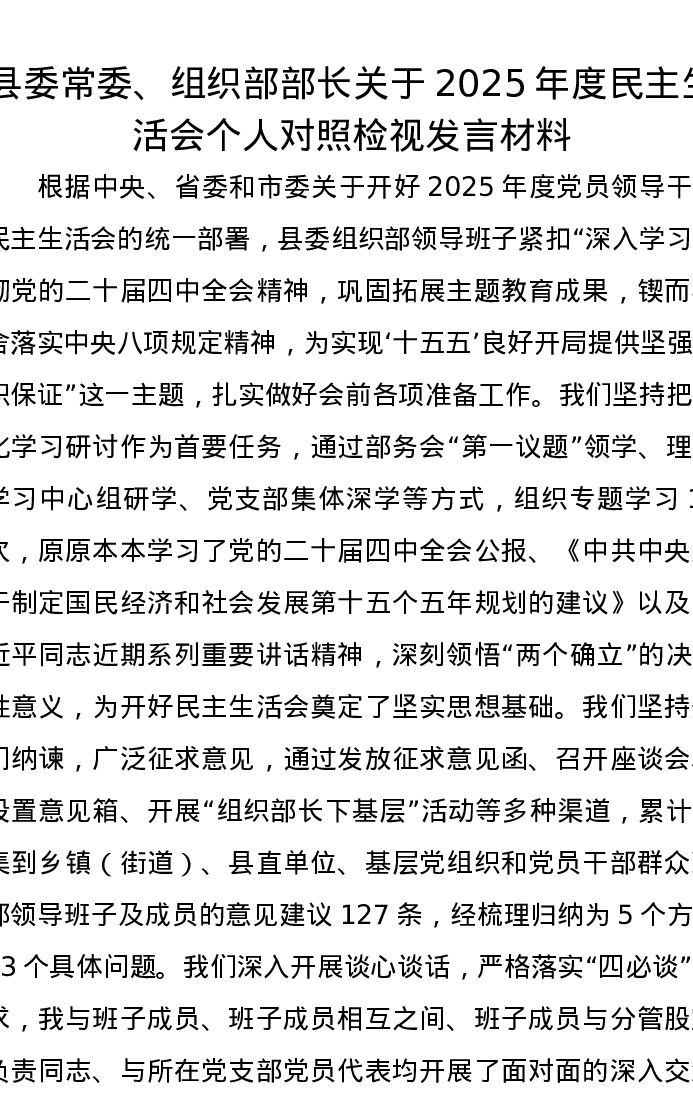 县委常委、组织部部长关于2025年度xxxxx个人对照检视发言材料(五个带头)