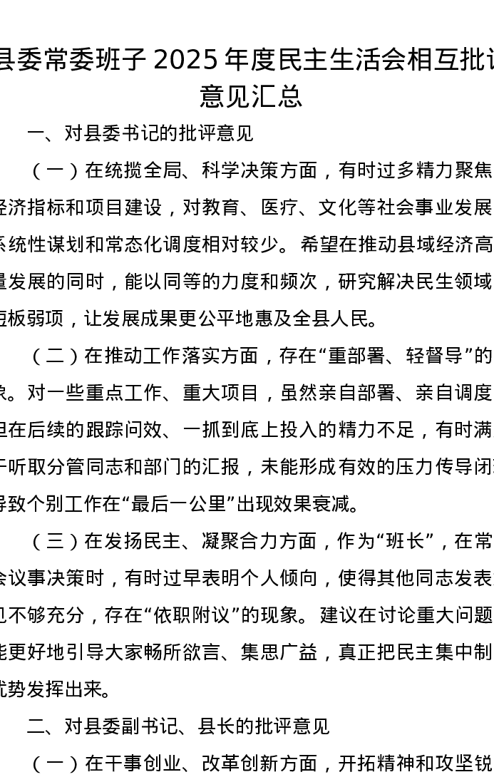 县委常委班子2025年度xxxxx相互批评意见汇总(五个带头)