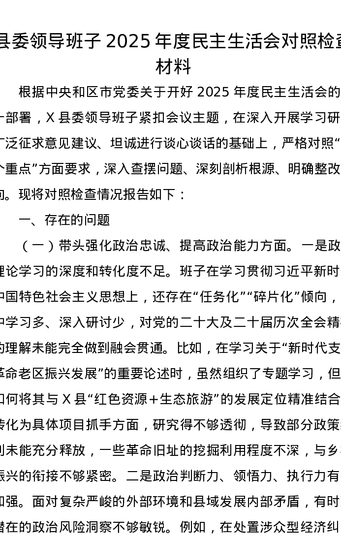 县委领导班子2025年度xxxxx对照检查材料(五个带头)