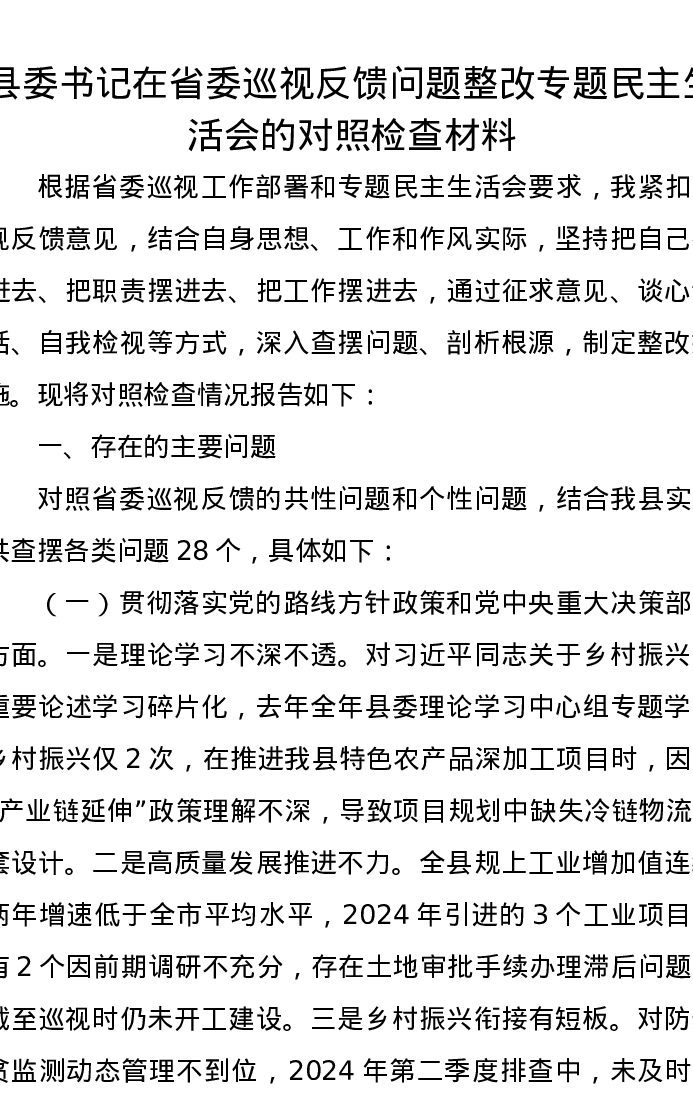 县委书记在省委巡视反馈问题整改专题xxxxx的对照检查材料