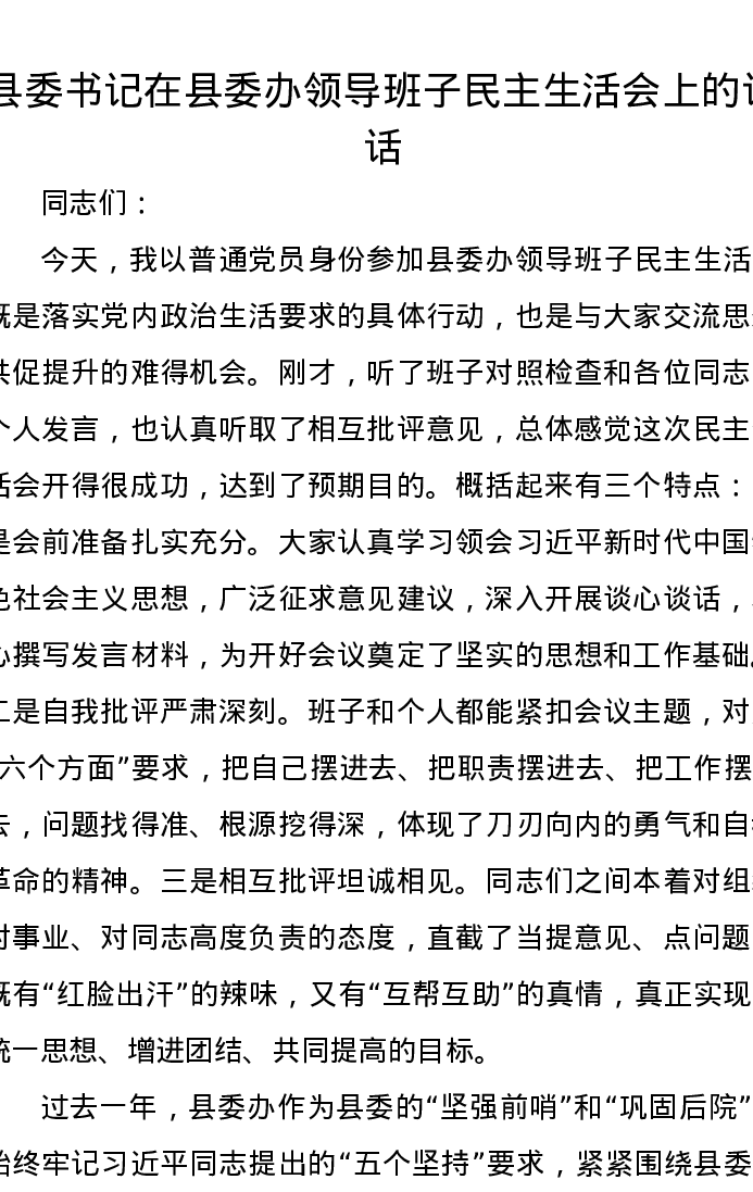 县委书记在县委办领导班子xxxxx上的讲话