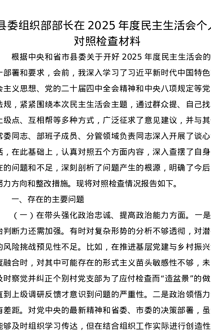 县委组织部部长在2025年度xxxxx个人对照检查材料(五个带头)