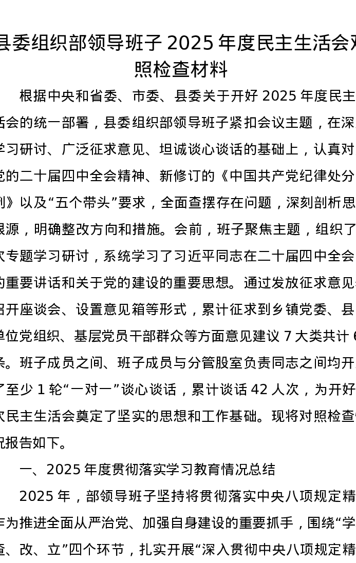 县委组织部领导班子2025年度xxxxx对照检查材料(五个带头)