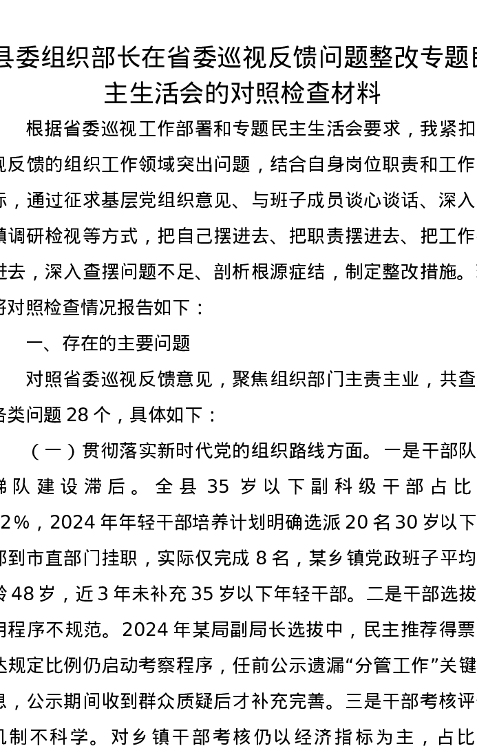 县委组织部长在省委巡视反馈问题整改专题xxxxx的对照检查材料