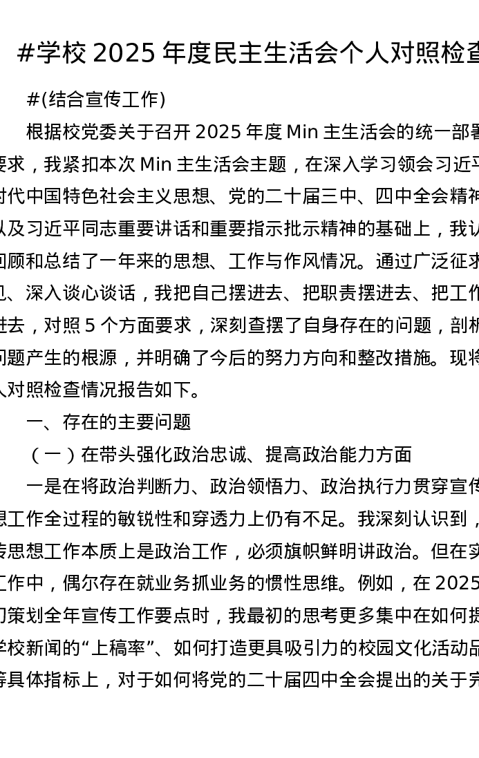 学校2025年度xxxxx个人对照检查(结合宣传工作)五个带头