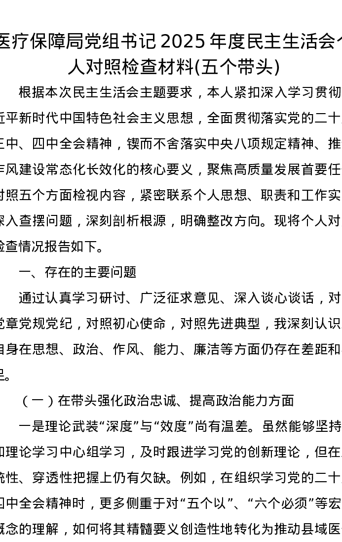 医疗保障局党组书记2025年度xxxxx个人对照检查材料(五个带头)