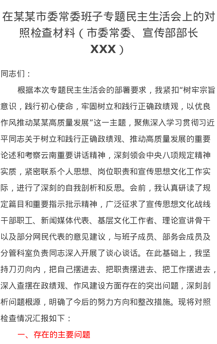 在某某市委常委班子专题xxxxx上的对照检查材料(市委常委、宣传部部长XXX)