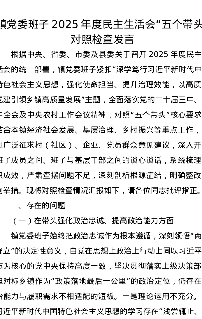 镇党委班子2025年度xxxxx五个带头对照检查发言