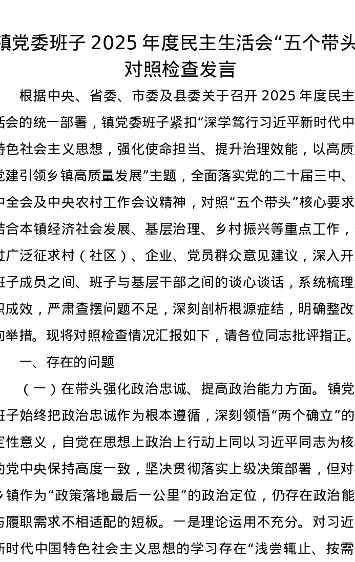 镇党委班子2025年度xxxxx五个带头对照检查发言