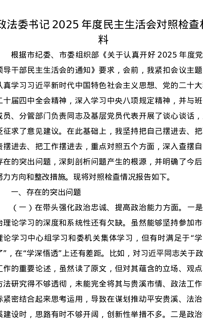 政法委书记2025年度xxxxx对照检查材料(五个带头)
