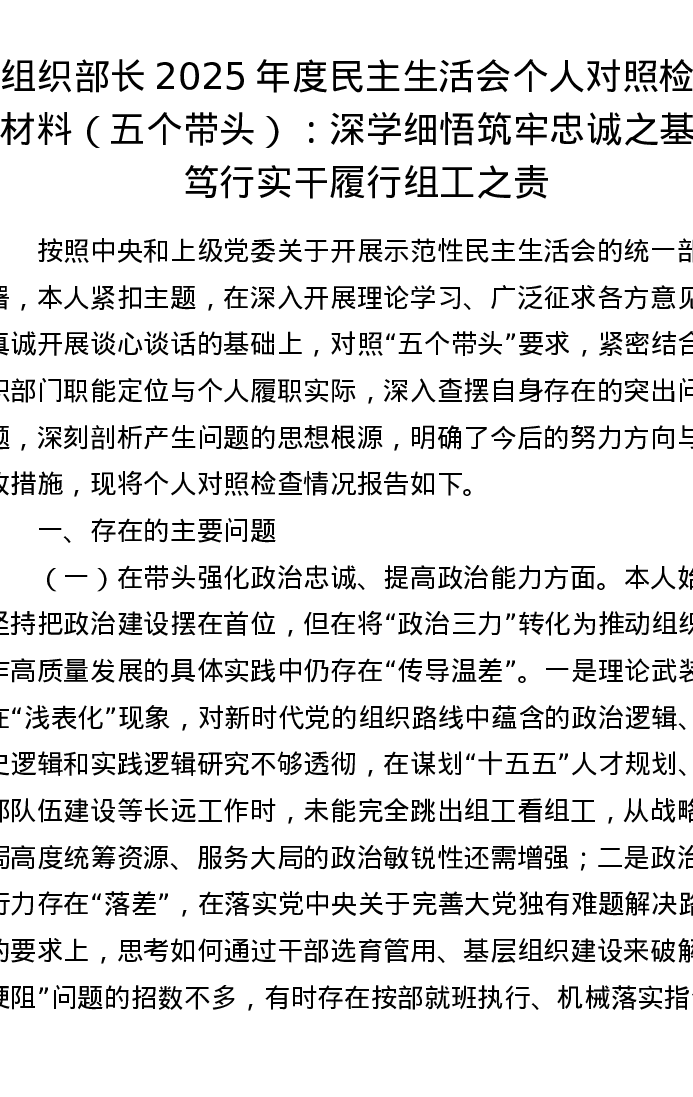 组织部长2025年度xxxxx个人对照检查材料(五个带头):深学细悟筑牢忠诚之基,笃行实干履行组工之责