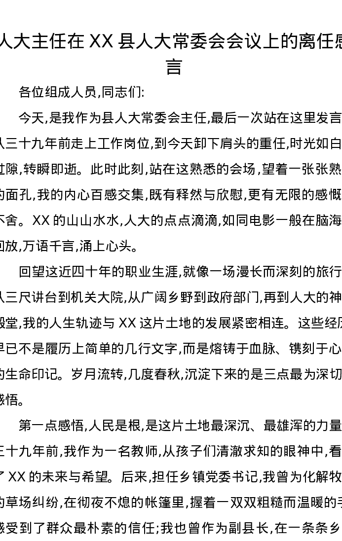 人大主任在XX县人大常委会会议上的离任感言