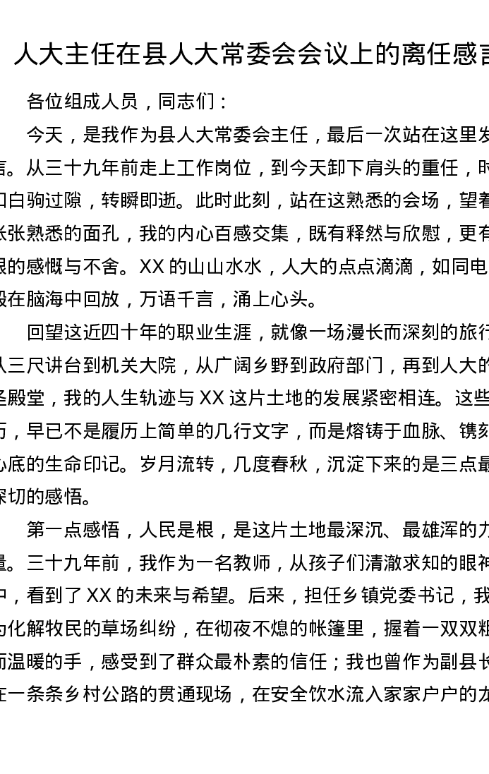 人大主任在县人大常委会会议上的离任感言