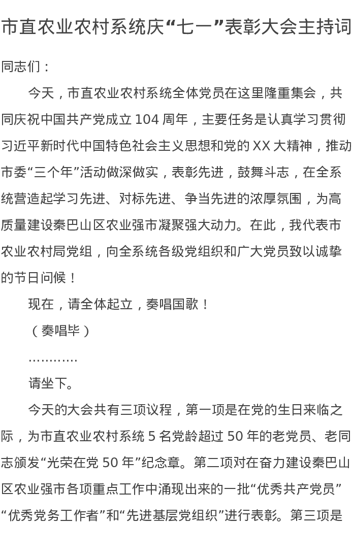 市直农业农村系统庆七一表彰大会主持词
