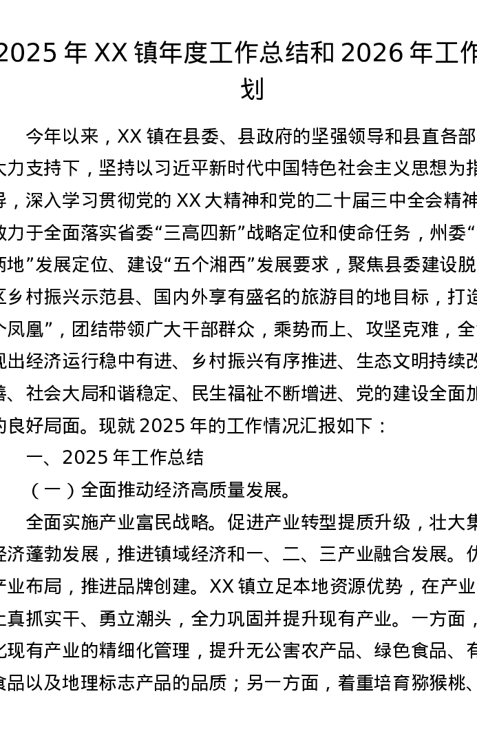 2025年XX镇年度工作总结和2026年工作计划