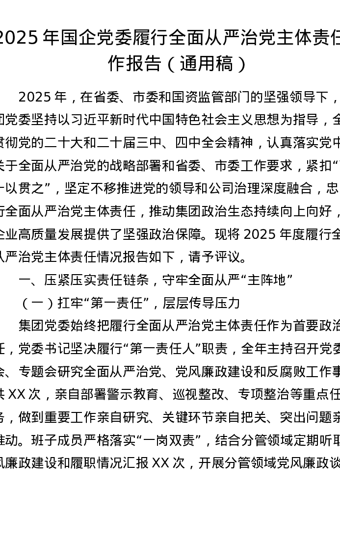 2025年国企党委履行全面从严治党主体责任工作报告(通用稿)