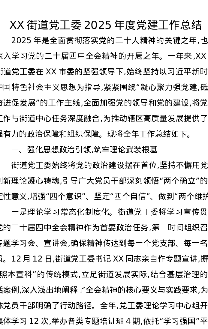 XX街道党工委2025年度党建工作总结