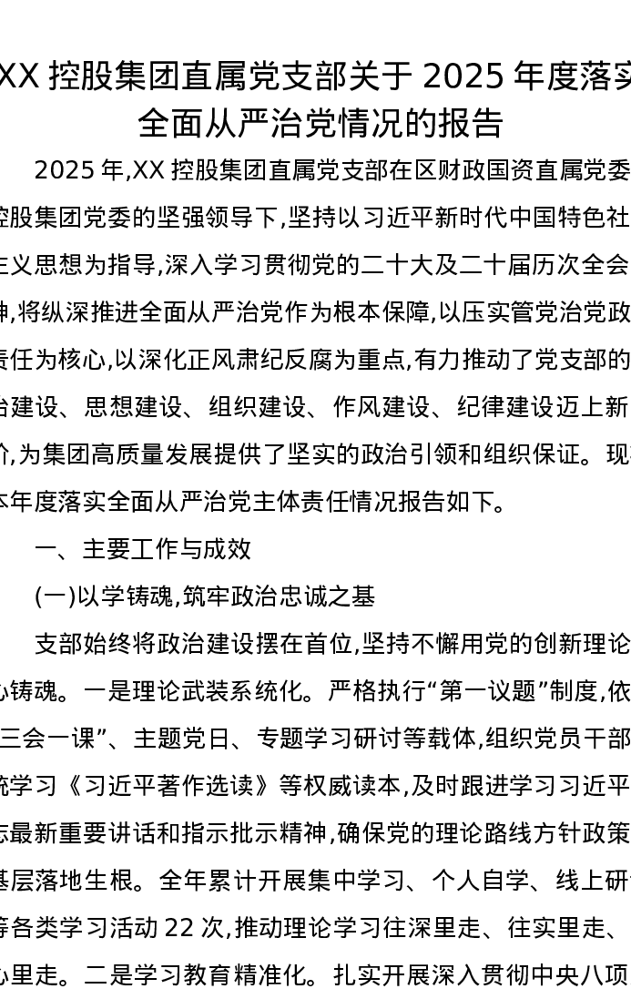 XX控股集团直属党支部关于2025年度落实全面从严治党情况的报告
