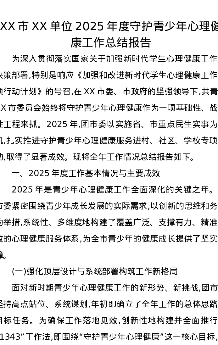 XX市XX单位2025年度守护青少年心理健康工作总结报告