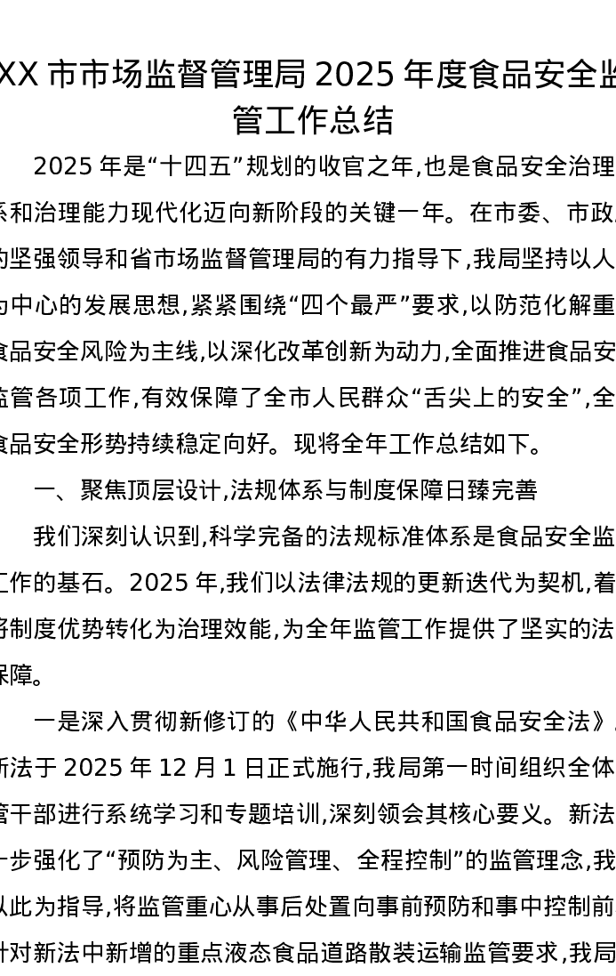 XX市市场监督管理局2025年度食品安全监管工作总结