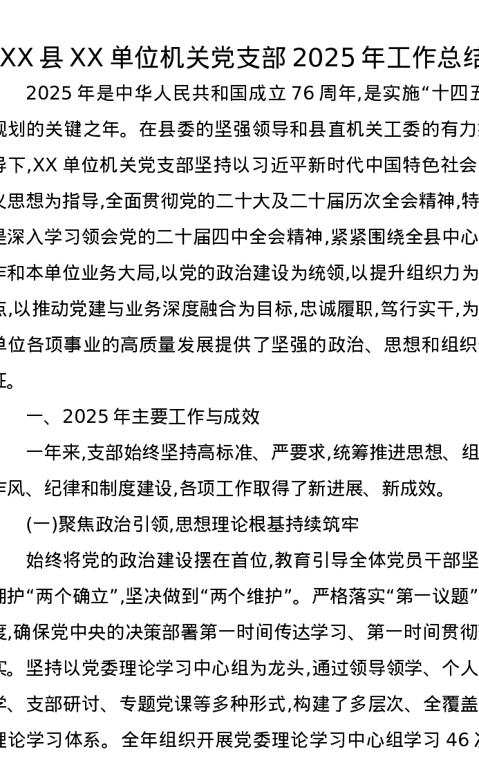XX县XX单位机关党支部2025年工作总结