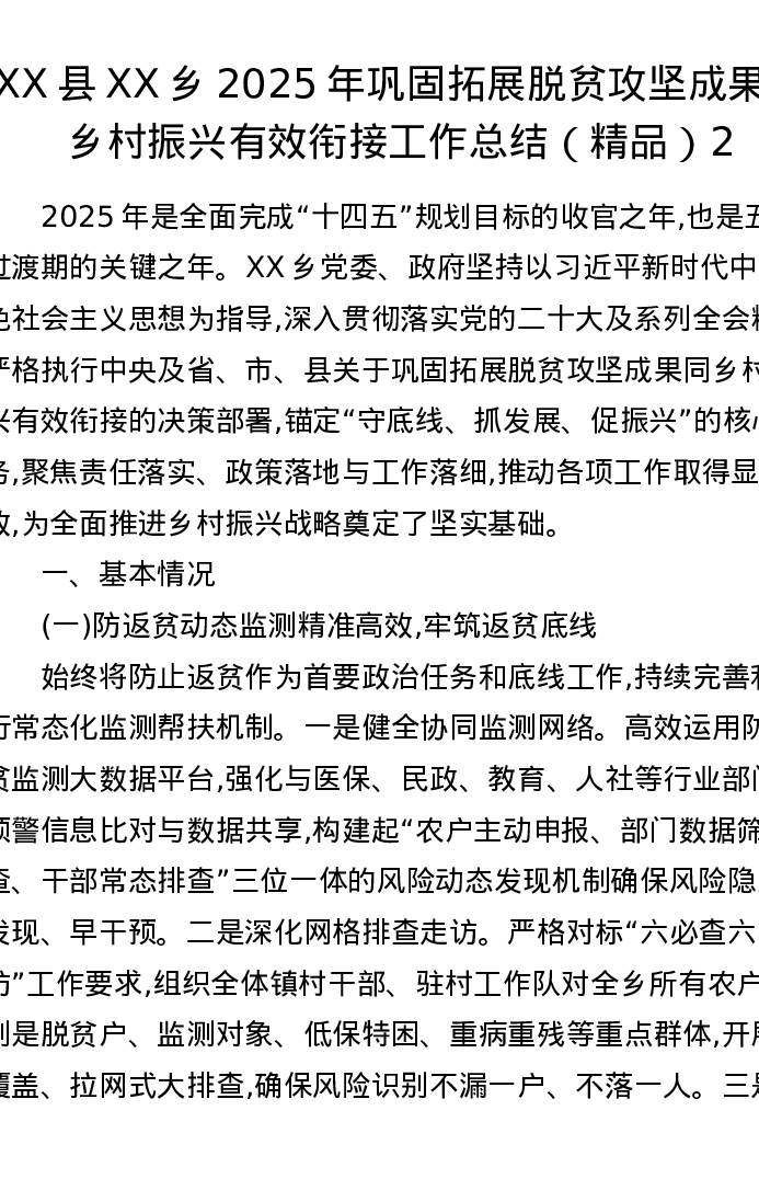 XX县XX乡2025年巩固拓展脱贫攻坚成果同乡村振兴有效衔接工作总结2