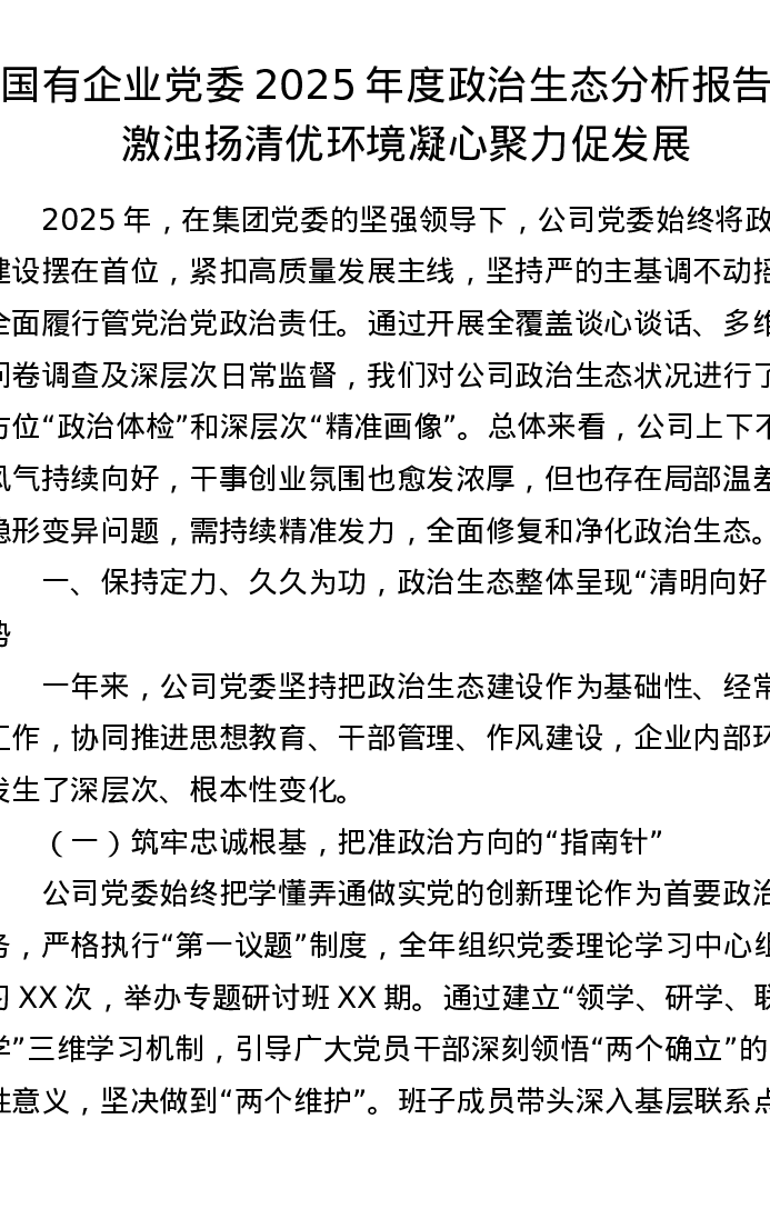 国有企业党委2025年度政治生态分析报告:激浊扬清优环境 凝心聚力促发展
