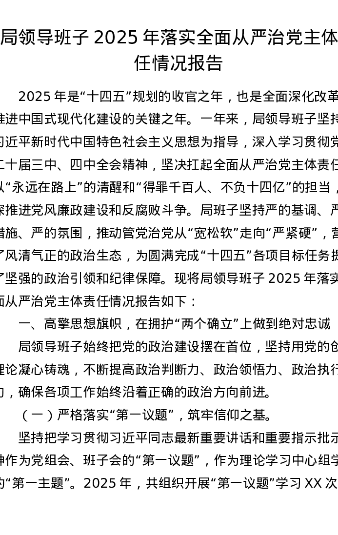 局领导班子2025年落实全面从严治党主体责任情况报告