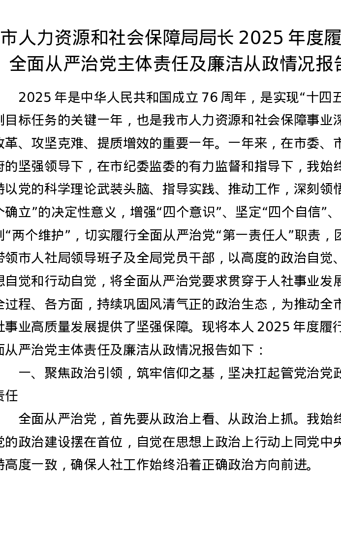 市人力资源和社会保障局局长2025年度履行全面从严治党主体责任及廉洁从政情况报告