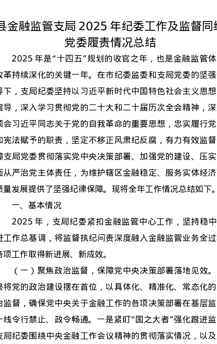 县金融监管支局2025年纪委工作及监督同级党委履责情况总结