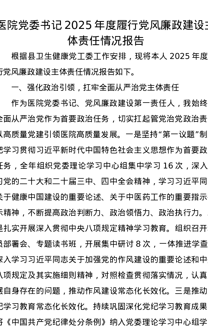 医院党委书记2025年度履行党风廉政建设主体责任情况报告
